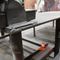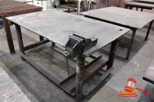 CUSTOM STEEL WELDED WORK BENCH WITH 20mm STEEL PLATE TOP, AND BENCH MOUNTED OFFSET VICE, APPROX 2000mm x 890mm x 815mm.