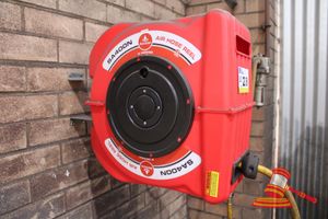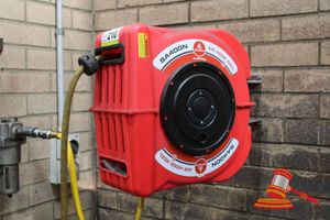STRATA RETRACTABLE AIR HOSE REEL, WALL MOUNTED. NOTE: BUYER TO REMOVE.