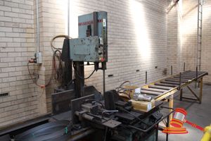 BAND SAW, MAKE: GEOCAM, MODEL/SERIAL/DOM: UNKNOWN, ELECTRIC, 3 PHASE, 4 PIN PLUG WITH 3 x ROLLER FEED STANDS, APPROX 3910mm x 610mm x 860mm, 1 x 3980MM x 610mm x 860mm AND 1 x 1400mm x 610mm x 860mm, INCLUDING 2 POST GUARD RAIL, APPROX 1370mm x 1060mm, FIXED TO FLOOR, AND AIR OPERATED CLAMPS/VICES. OPERATIONAL, CONDITION: UNTESTED. NOTE: BUYER TO REMOVE AT OWN EXPENSE.