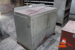STEEL STORAGE CABINET, 2 DOOR, APPROX 1300mm x 1300mm x 1400mm, FOR MIG WIRE STORAGE, INCLUDING 4 x ROLLS OF HYUNDAI 1.2mm WELDING WIRE, AS NEW.