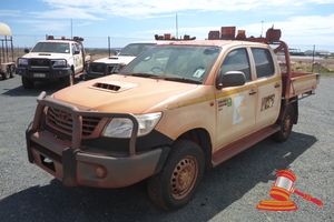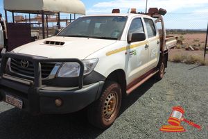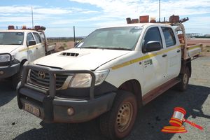 3/2015 TOYOTA HILUX SR 150 SER DUAL CAB TRAY BACK, WHITE, 4X4, MANUAL, P/S, A/C, 3.0LTR TURBO DIESEL, STEEL BULLBAR, SIDESTEPS, WORKLIGHTS, TOW ASSEMBLY, TRAY MOUNTED STEEL TOOLBOX, REAR WINDOW GUARD, REG NO - (UNLIC) ODO - 218,679KMS SHOWING, VIN# MR0FZ22G401207265 (LV151) (SK#) (*NOTE - MULTIPLE CORROSION SPOTS ON ROOF PANEL AND AROUND WINDSCREEN FRAME, CHASSIS & UNDER CARRIAGE HEAVILY CORRODED, TRAY FLOOR CORRODED THROUGH, PANEL DAMAGE TO FRONT & REAR DRIVER'S SIDE DOORS, AUDIO SCREEN SMASHED INDICATOR LENS MISSING, CAB INTERIOR DUST STAINED, BATTERY U/S*)