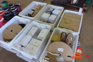 QTY OF VARIOUS ELECTRICAL CONSUMABLES, INCLUDING ELECTRICAL CAPS, COMMS CABLES, EARTH WIRE, 300A BREAKER, TERASAKI TC 630A 3P CONTACTOR, 3 X CHALMIT EMERGENCY LIGHT, TERASAKI 600A BREAKER