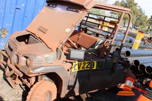 IMPACT DAMAGE TO FRONT, SNAPPED & BENT SUSPENSION COMPONENTS, EXHAUST MISSING, CLUTCH & BELTS MISSING, CLUTCH COVER MISSING, TRAY MISSING, DOOR CRUSHED & DO NOT CLOSE, FRONT HOOD MISSING, TYRES DEFLATED, HOUR METER & SCREEN MISSING