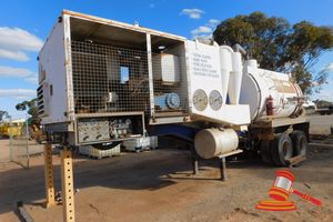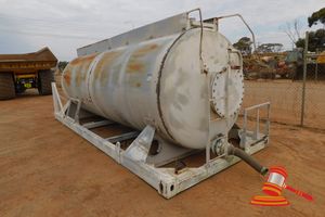 18,000LT LINED STEEL TANK, TWIST LOCK FRAME REAR FILL AND DISCHARGE (4 TONNE NET), INCLUDING REAR, BUMPER ASSEMBLY (REMOVED) WITH DIESEL POWERED 4 INCH, PUMP SET UP WITH SIDE AND CENTRE SPRAYS (AIR OPERATED) ACTUATORS) 4 INCH BUTTERFLY VALVE AND HOSE REEL