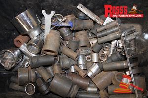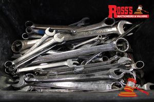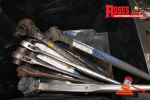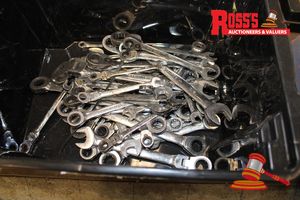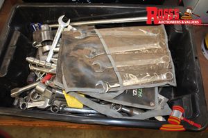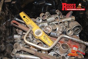PLASTIC TUB CONTAINING QUANTITY OF LARGE SOCKETS, WRENCHES AND SPANNERS