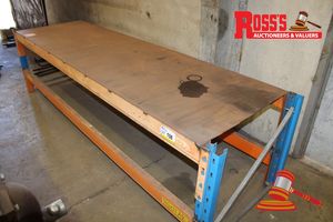 WORKBENCH, METAL FRAME (WELDED DEXION) WITH PLY TOP AND SHELF, APPROX 3000mm X 900mm X 850mm H