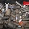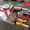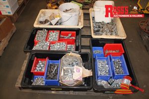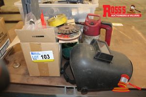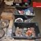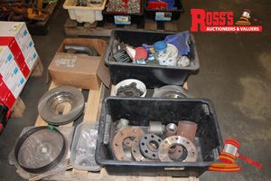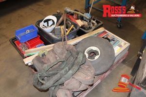 PALLET CONTAINING VARIOUS METAL PLATES, DRIVE CHAIN, ALUM PUTTY, LITHIUM GREASE, DEGREASER, PIPE ELBOWS, SAW BLADES, PRESSURE CAPS