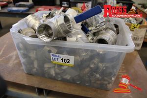 PLASTIC TUB CONTAINING QUANTITY OF STAINLESS STEEL PIPE FITTINGS/VALVES