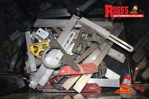 PLASTIC TUB CONTAINING VARIOUS RULERS, SQUARES AND GAUGES.