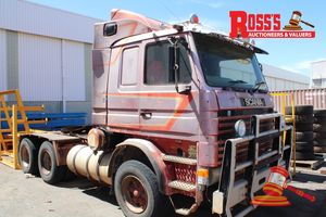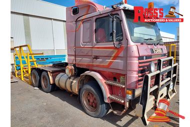 PRIME MOVER, MAKE: SCANIA, MODEL: 142H, 6X4, DOM: 12/1987, CHASSIS: 1122695, S/N: AU1375, REGISTRATION: 1ELA946, REG EXPIRY: 23/11/2023, ODOMETER: 568,967KM SHOWING, TRANSMISSION: MANUAL, FUEL TYPE: DIESEL, SPRING SUSPENSION, YARD PIN, SLEEPER, EXTRAS: CB RADIO, NO KEY, BODY DAMAGE RUST, AERO KIT, BULL BAR, SPOTLIGHTS. CONDITION: UNTESTED