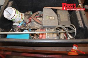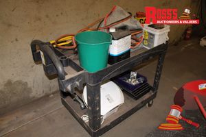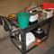 JANITOR TROLLEY, 2 TIER, ON CASTORS INCLUDING CONTENTS OF: KITCHEN GRILL, PLASTIC TUBS, TRIPOD, SPREY BOTTLE, JUMPER CABLES AND MISCELLANEOUS ITEMS.