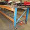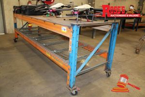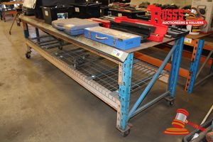 WORKBENCH, METAL FRAME, METAL TOP, 2 TIER WITH WIRE SHELF, ON CASTORS, APPROX 2935mm X 955mm X 900mm H