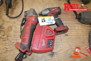 MILWAUKEE CORDLESS POWER TOOL BUNDLE: 1 X 115mm ANGLE GRINDER, MODEL: HD18AG, NO BATTERY; 1 X 13mm IMPACT WRENCH, NO BATTERY; 1 X CHARGER, MODEL: C12C, 240V 10AMP PLUG. CONDITION: UNTESTED.