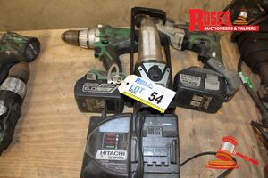 HITACHI CORDLESS POWER TOOL BUNDLE: 1 X 16mm ROTARY HAMMER DRILL, MODEL: DH 18DL WITH BATTERY; 1 X IMPACT DRIVER, MODEL: DV 18DSOL WITH BATTERY; 1 X LIGHT, MODEL: UB 18DL, NO BATTERY; 1 X CHARGER, MODEL: UC 18YRSL, 240V 10AMP PLUG. CONDITION: UNTESTED.