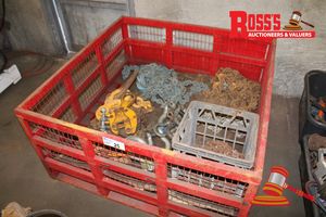 PALLET CAGE CONTAINING QUANTITY OF LIFTING CHAINS, HOOKS, SHACKLES AND 1 x 2T PLATE LIFTING CLAMP
