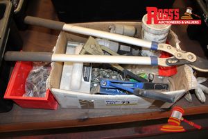 BUNDLE CONSISTING OF: 1 X GARDENING SHEARS, 2 X RIVET GUNS, HAND SANDER, D SHACKLES AND MISCELLANEOUS ITEMS