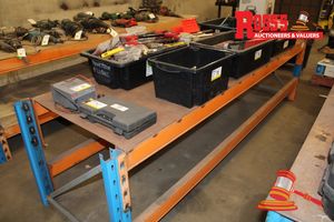 WORKBENCH, STEEL FRAME, STEEL TOP, APPROX 3150mm X 800mm X 915mm H; WITH 4 X METAL WALL MOUNTABLE RED TOOL HOLDERS