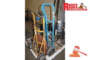 1 X BOX TROLLEY, BLUE, SOLID WHEELS AND 1 X BOX TROLLEY, ORANGE, PNEUMATIC TYRES
