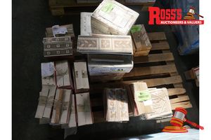 PALLET CONTAINING: 3 x BOXES BORDER TILES, REPISA NEGRO MARQUINIA, APPROX 48 PIECES; 3 x BOXES BORDER TILES, PALACE SABIA, APPROX 72 PIECES; 6 x BOXES BORDER TILES, CUENCA AZUL, APPROX 300 PIECES; 8 x BOXES BORDER TILES, CANCUN MARFIL 2.5x20, APPROX 136 PIECES; 3 x BOXES BORDER TILES, BORDURA MARMOL CREMA, APPROX 64 PIECES; 5 x BOXES BORDER TILES, SAHARA MARFIL 4.1x35, APPROX 120 PIECES.