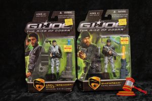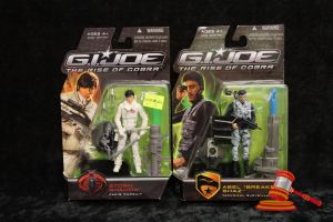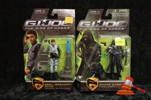 G.I. JOE, RISE OF THE COBRA FIGURINES, INCLUDING: 1 x ABEL "BREAKER" SHAZ, TECHNICAL SURVEILLANCE, SEALED; AND 1 x SNAKE EYES, PARIS PURSUIT, SEALED. MAKE: HASBRO