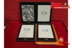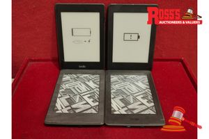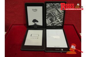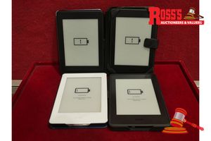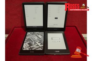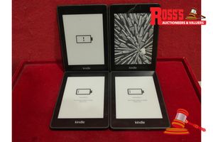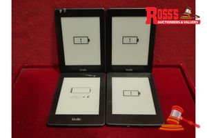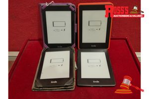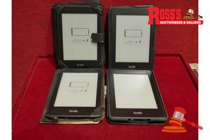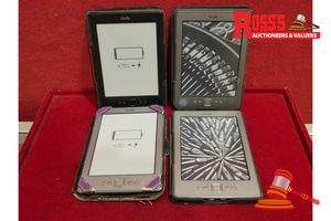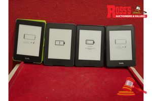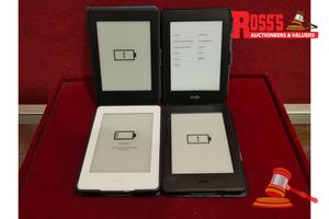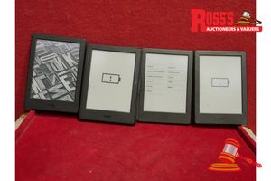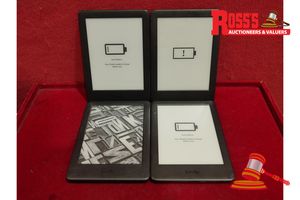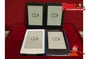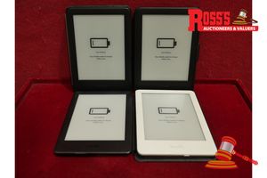 BUNDLE OF 4 x KINDLE E READERS, 2 x MODEL# M2L4EK, ONE WITH COVER, 2 x MODEL# D01100, NO CHARGERS, UNTESTED