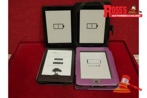 BUNDLE OF ASSORTED E READERS, 1 x TOLINO, MODEL# UNKNOWN, 1 x SONY, MODEL# PRS PRS-T2, 1 x I READER, MODEL# R6801, 1 x POCKETBOOK, MODEL# PB740-2, NO CHARGERS, UNTESTED