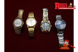 BUNDLE OF 4 x WHITE AND YELLOW METAL WATCHES INCLUDING: 1 x WHITE METAL, BLUE FACE WITH DATE WINDOW, MARKED EMPORIO ARMANI, W/R 50m, 1 x WHITE AND YELLOW METAL, BLUE FACE WITH DATE WINDOW, MARKED VERSACE, W/R50m, 1 x YELLOW METAL, BLACK FACE WITH DATE WINDOW, MARKED CHISEL, W/R 100m, 1 x YELLOW METAL, WITH DATE WINDOW, MARKED CITIZEN, WR50m, UNTESTED AUTHENTICITY UNVERIFIED