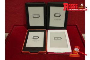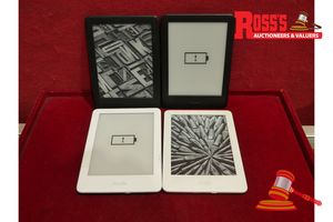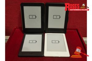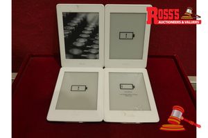4 x KINDLE E READERS, WHITE, MODEL# DP75SDI, NO CHARGERS, UNTESTED