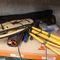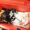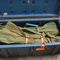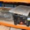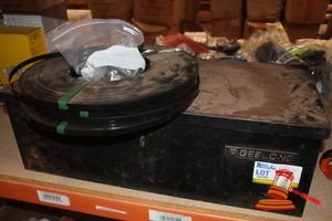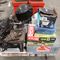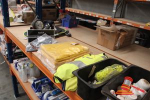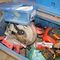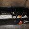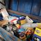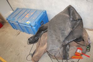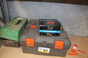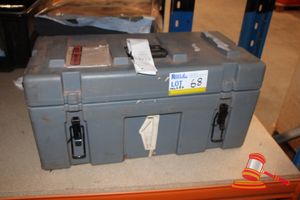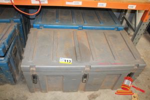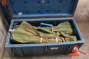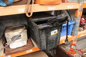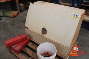 STORAGE BOX CONTAINING VARIOUS FIRST AID EQUIPMENT, TARPS, STATIONERY, SCALES, MAGNETS AND CARGO COVER