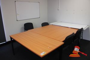 BUNDLE INCLUDING 3 x DESKS W750mm x L1500mm x H720mm, 4 x OFFICE CHAIRS, 2 x WHITEBOARDS, 1 x COLLAPSABLE TABLE, 1 x STORAGE TABLE W900m x L1500mm x H630mm, 2 x SHELVES