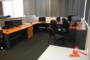 BUNDLE INCLUDING OFFICE FURNITURE 1 x DESK W900 x L1800mm x H720mm, 2 x 3 SECTION DESKS W1800mm x W1800mm x H720mm, 2 x DESK DRAWERS W520 x L420 x H660mm ON WHEELS, 1 x STORAGE UNIT W320mm x L920mm x H900mm INCLUDING ALL COMPUTER SCREENS, CORDS AND KEYBOARDS, 3 x OFFICE CHAIRS, 2 x COMPARTMENT DIVIDERS