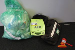 1 x OFFROAD FIRST AID (MAY BE INCOMPLETE), BAG OF FIRST AID EQUIPMENT INCLUDING BANDAGES, HEAT BLANKETS, WOUND DRESSINGS, 1 x ZOLL AED PLUS DEFIBRILLATOR