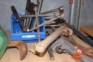 BUNDLE CONTAINING SPANNERS, VICE CLAMPS, SOCKETS, BREAKER BARS, PIPE WRENCHES ETC.