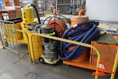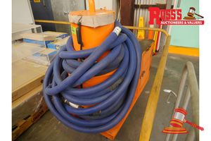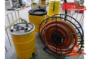 - AMTEC LAMB ELECTRIC VACUUM UNIT, MODEL# 122172-18, 3 x 1700W VACUUM MOTORS, 240V, 213mm 1STG, NEW MOTORS, 1 x HOSE REEL WITH HOSE (SECTION OF ORANGE HOSE ATTACHED TO HOSE REEL), 1 x YELLOW INTERCEPTOR DRUM WITH ASSORTED ATTACHMENTS