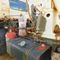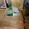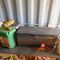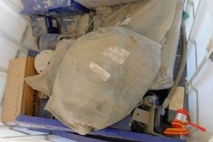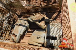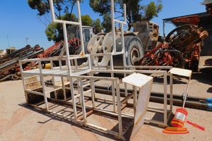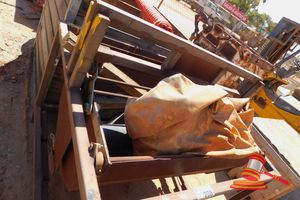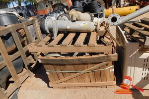 WOODEN CRATE CONTAINING GUARD LANDING LEGS, AIR PUMP CONDITION UNKNOWN & 1 x FABRICATED SELF EMPTYING BIN