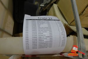 WOODEN CRATE CONTAINING LARGE ASSORTMENT OF PLOUGH BOLTS 1 1/4 - 7 UNC, 3/4 10 UNC, KOMATSU SPACERS 21N-30-17640, 7 x WING SHROUDS, DEWA 50 x 800-1 PIN FASTENERS & LOCKING PINS