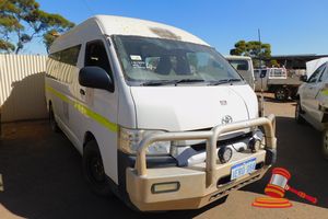 1/2015 TOYOTA HIACE COMMUTER BUS, 4x2, AUTOMATIC, DIESEL, ROOBAR, SPOTLIGHTS, 2 WAY RADIO, FIRE EXTINGUISHER, BEACON, REV ALARM, 11 SEATER, ISOLATOR, REG# 1ERO084, EXPIRY DATE: 15/08/2025, ODO: 157,736KMS SHOWING, VIN#JTFST22P200022501 (DR#6228) (*NOTE - SURFACE RUST ON BODY, STONE CHIPS AND SURFACE RUST DAMAGE FROM STICKER REMOVAL, SOME PANEL DAMAGE TO SIDE ACCESS, DOOR ENGINE LIGHT AND TIMING BELT LIGHT ON, DEEP RUST LIFTING REAR DOOR)