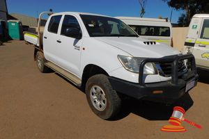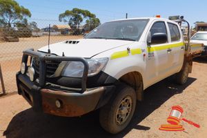 7/2013 TOYOTA HILUX DUAL CAB, WHITE, 4x4, MANUAL, ROPS TRAY, ROOBAR, TOWBAR, BEACON, REV ALARM, WORKLIGHTS, ISOLATOR, REG NO - (UNLIC) ODO - 394,000 LAST RECORDED, VIN# MR0FZ22G401077777 (LV540) (DR#6226) (*NOTE - NON RUNNER, CENTRE OF DASH REMOVED, GEAR STICK SURROUND MISSING SUN VISORS MISSING, DRIVERS WINDOW STUCK DOWN, SOME ENGINE COMPONENTS MISSING INCLUDING INJECTORS, LINES & BATTERY, RUST PITTING IN TRAY, SOME PAINT CHIPS*)