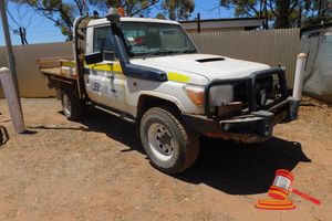 2/2018 TOYOTA LANDCRUISER TRAY TOP, WHITE, 4x4, MANUAL, P/S, A/C, DIESEL, ROOBAR, SNORKEL, ISOLATOR, BEACON, REV ALARM, WORK LIGHT, CAB MOUNTED FIRE SUPPRESION, REG NO - (UNLIC) ODO - UNKNOWN, VIN# JTELV71J707402888, (DR#6224) (*NOTE - 2 x FLAT TYRES, NO PASSENGER DOOR, HEAVY RUST IN GUARDS, CAB, ROOBAR & CHASSIS, NO IGNITION KEYS, DRIVES DOOR & GUARD DAMAGED*)