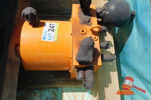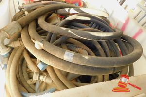 PALLET CONTAINING HYDRAULIC PISTON PUMP# A6U107HD12FP2070 AND ASSORTED HYD HOSES, 1 x STEEL STORAGE BOX, CONTAINING JUMPER LEADS, POWER CORDS, MAKITA TECK GUN, VERNIERS AND 4x4 TERRAIN TAMER FLARE KITS