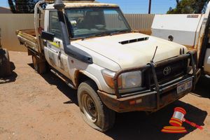 2/2012 TOYOTA LANDCRUISER TRAY TOP, WHITE, 4x4, MANUAL, P/S, A/C, DIESEL, ROOBAR, TOW BAR, SNORKEL, ISOLATOR, DUAL FUEL, UPGRADED SUSPENSION, SECONDARY FUEL FILTER, REG NO - KBC913C (LIC 31/7/2025) ODO - 154,921KMS SHOWING, VIN# JTELV71JX00025448, ENGINE# 1VD0152971 (LV662) (DR#6233) (*NOTE - MINUS TRAY, DENTS ALL DOWN R/H/SIDE MINOR, SURFACE RUST, VARIOUS PAINT CHIPS, DRIVERS DOOR INNER COVER DAMAGED, RUST THROUGH CAB SILLS, REAR# PLATE MISSING*)