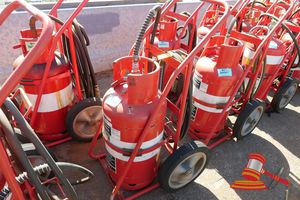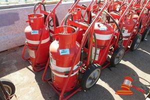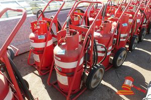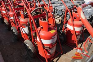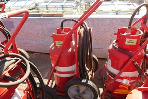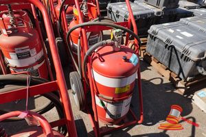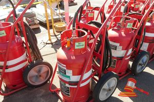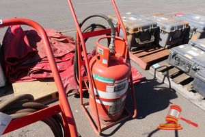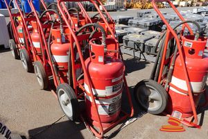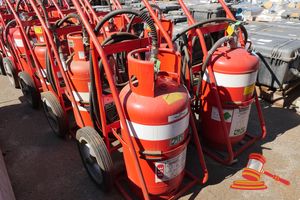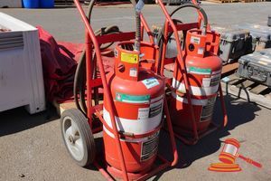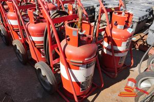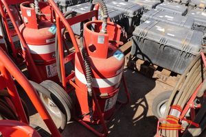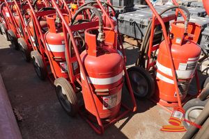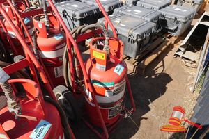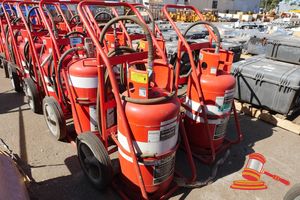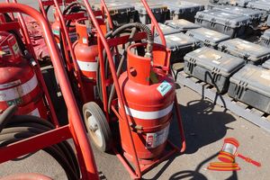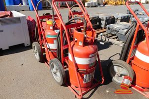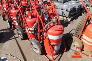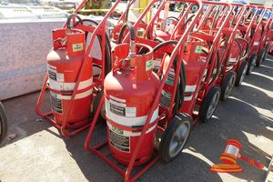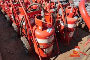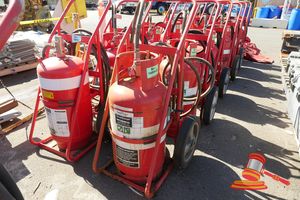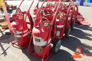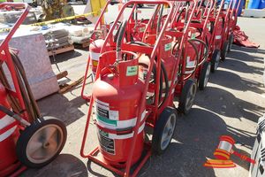 50KG CHUBB MOBILE DRY POWDER B.E TYPE FIRE EXTINGUISHER ON TROLLEY WITH HOSE MODEL# DM5000SWDS, UNTESTED