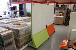 GLASS WHITEBOARD, GREEN, ON CASTORS - GENERAL WEAR & TEAR - APPX W1220mm x H1800mm x D480mm