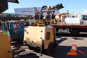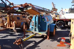 SINGLE AXLE, 4X LIGHT HEADS, 299 HRS SHOWING, STABILISER LEGS DAMAGED, NO JOCKEY WHEEL OR STAND, NO VIN PLATE SIGHTED, 1X TYRE FLAT, REAR LIGHT COVERS TO TRAILER REMOVED, 1 X REAR STABILISER LEG REMOVED, NO BEACON