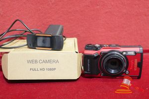 1 X OLYMPUS TOUGH DIGITAL CAMERA MODEL 1M015 (RED). NO ACESSORIES AND 1 X WEB CAMERA FULL HD 1080. UNTESTED
