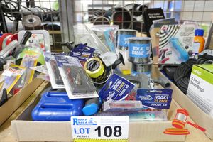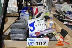 TRAY OF ASSORTED FISHING EQUIPMENT INCLUDING REELS, LINE, LURES, DIVE BELT WEIGHTS