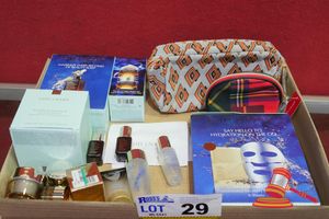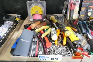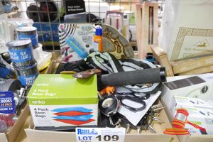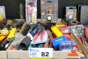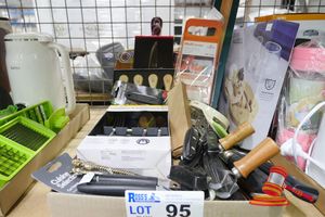 TRAY OF ASSORTED ITEMS INCLUDING MEGA KING 500 THREAD KING SHEET SET (WHITE), 2 X DUSK LIGHTERS, 4 X UTILITY KNIVES, EAR BUDS, MULTI PURPOSE TOOLS, SCISSORS, HOT POD