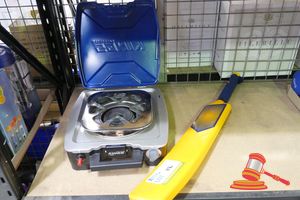 KINGS PORTABLE COOKER (BLUE) USED AND YELLOW PLASTIC CRICKET BAT