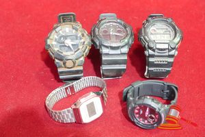 5 X ASSORTED DIGITAL WATCHES INCLUDING CASIO, G SHOCK (3), BABY G (1). USED, UNTESTED