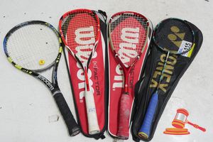 1 X YONEX BADMINTON RACKET IN CASE, 2 X WILSON SQUASH RACKETS IN CASES, 1 X BABOLAT AERO PRO DRIVE TENNIS RACKET (USED)